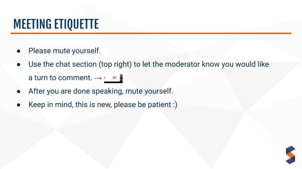 - The Moderator should start the meeting 15 minutes before the actual start time. This will allow people to join in, make sure they mute their mics and become familiar with the chat section.